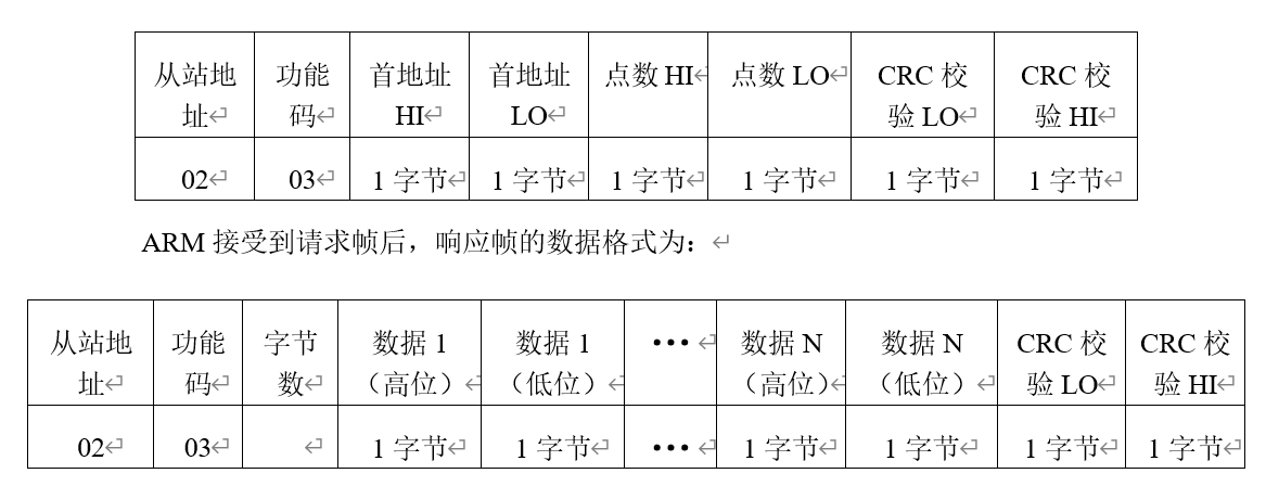 讀取ARM從站保持寄存器的數(shù)據(jù),PC、HMI的發(fā)送數(shù)據(jù)幀格式為: